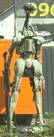 Military presence is part of daily life: a poster at a gas station calling for donations, military ambulances passing by, even robot soldiers casually on display in public spaces.